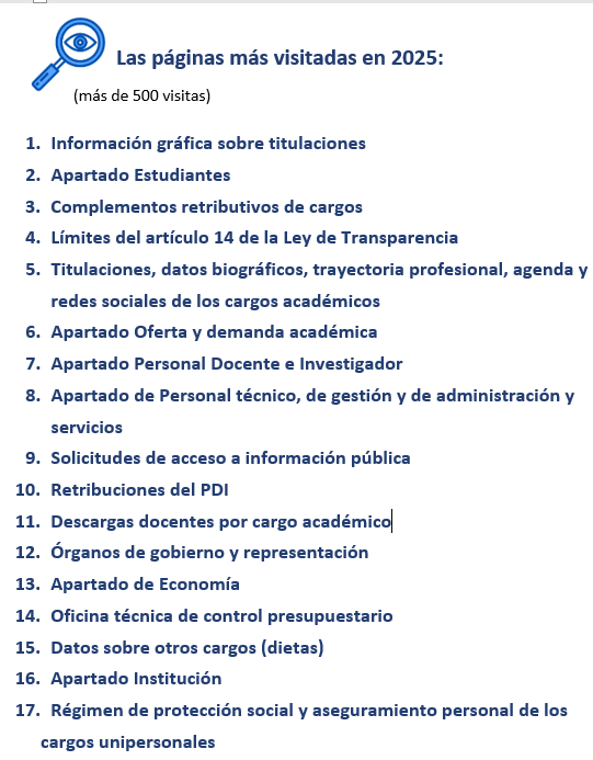 En cuanto a los asuntos que más interesan a las personas que visitan el portal, las titulaciones del campus y las relacionadas con estudiantes son las páginas más visitadas, seguidas de las páginas que recogen los complementos retributivos de cargos y las resoluciones negativas a peticiones de información pública basadas en el artículo 14 de la ley de Transparencia . En cuanto a los archivos, el documento de convenios de la Universidad es el más descargado.