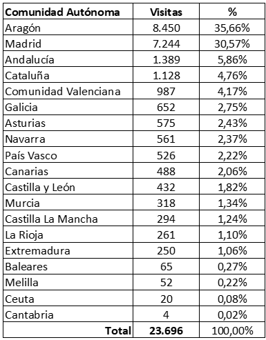El origen muestra que casi un 91% de las visitas proceden del continente europeo. De estas, el 77,65% (24.927) son desde España y dentro del país, en la distribución por Comunidades Autónomas, casi un 36% viene de Aragón y casi un 31% de Madrid: