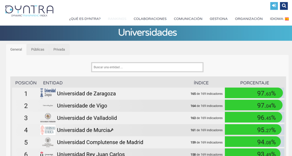 Dyntra es una plataforma colaborativa que tiene como objetivo medir la información pública de Gobiernos, Administraciones públicas, partidos políticos, cargos electos y los diferentes actores sociales. En el caso de las universidades, exige el cumplimiento de 169 indicadores agregados en cinco grandes áreas: transparencia institucional, comunicación pública, participación y colaboración ciudadana, transparencia económico-financiera y contrataciones de servicios.